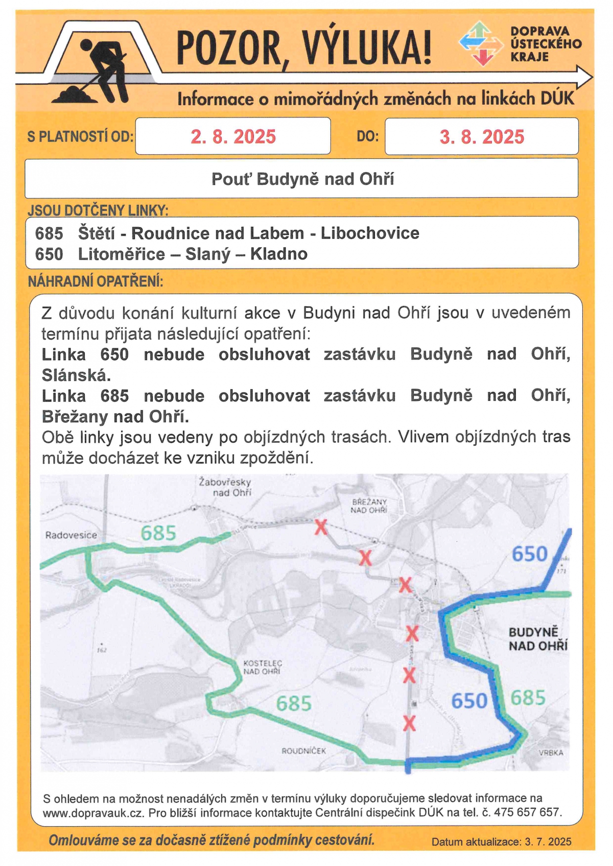 Z důvodu konání Budyňské pouti dojde v termínu od 2.8. do 3.8.2025 k výluce linek 650 a 685. Linky budou vedeny po objízdné trase. Nebudou obsluhovány zastávky Budyně n. O., Břežany nad Ohří a Budyně n. O., Slánská.