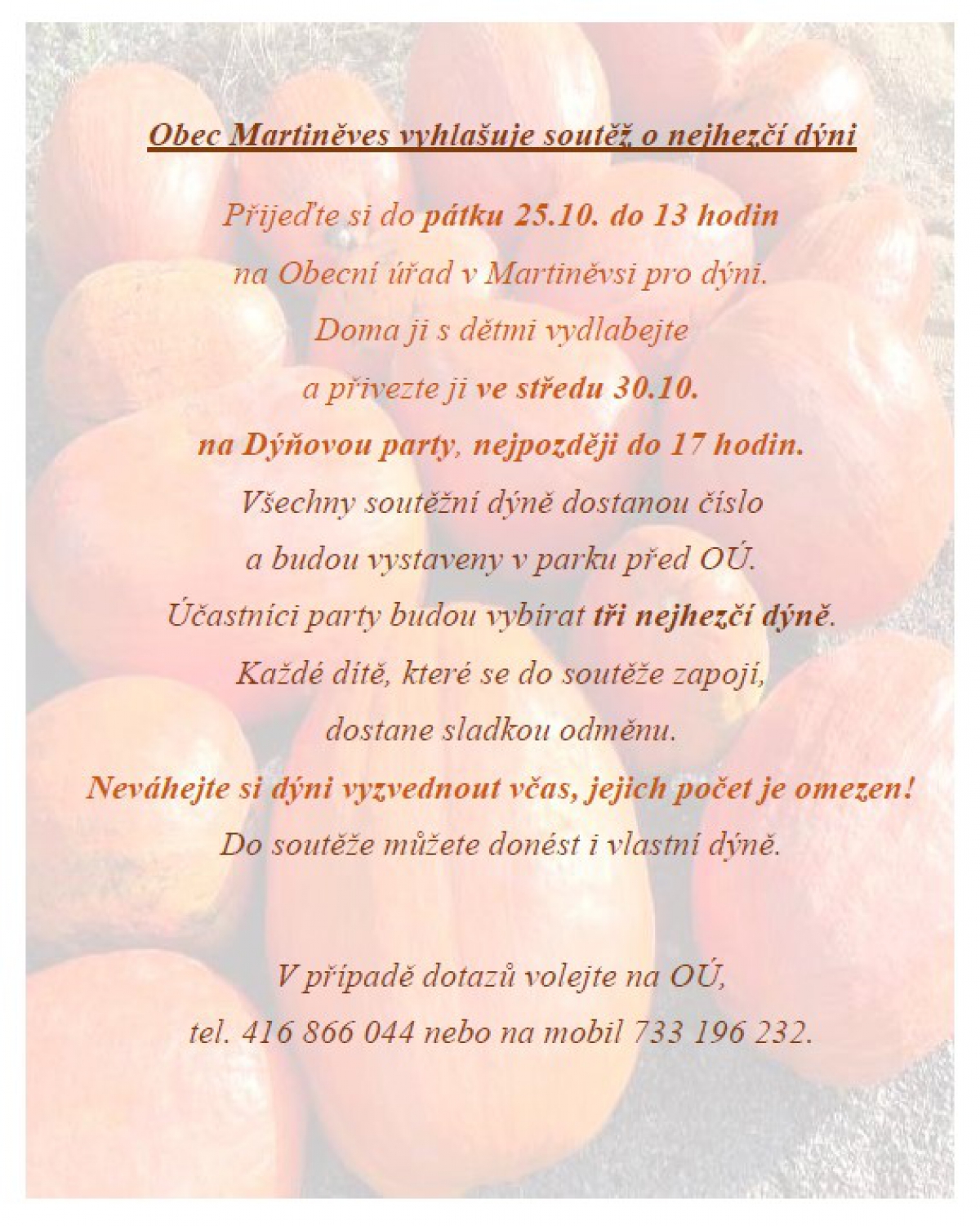 Ve středu 30.10. pořádáme Dýňovou party před OÚ v Martiněvsi. Lampionový průvod bude vycházet v 17 hodin od sokolovny. Přijďte přestrojeni za duchy, skřítky a jiná strašidla, budou připraveny soutěže, halloweenská stezka, diskotéka a opékání vuřtů. A také soutěž o nejhezčí dýni. Přijeďte si na OÚ do pátku 25.10. pro dýni, doma ji s dětmi vydlabejte a ve středu doneste na party před OÚ. Každé dítě, které se zapojí dostane sladkou odměnu.