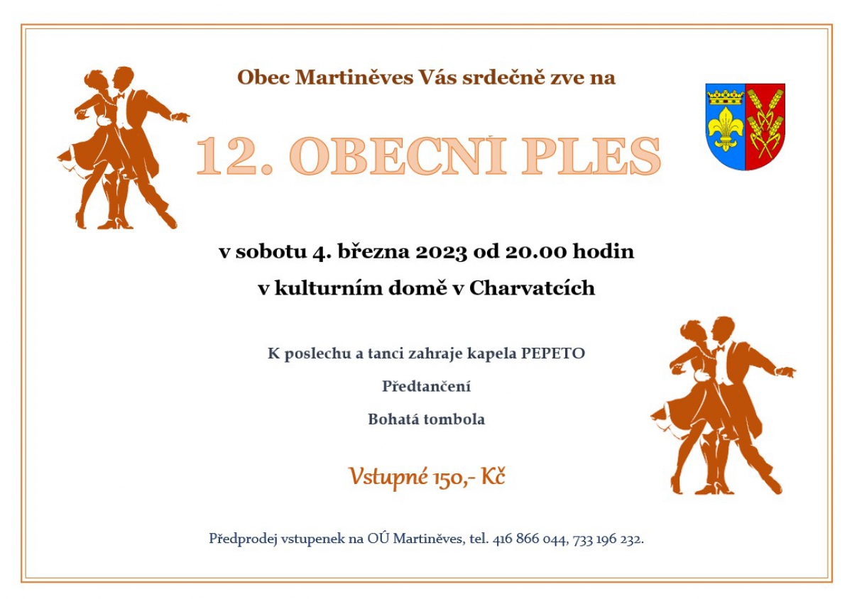 Obec Martiněves Vás srdečně zve na 12. Obecní ples, který se uskuteční v sobotu 4.3.2023 od 20 hodin v KD Charvatce. Vstupné je 150,- Kč a předprodej vstupenek na OÚ Martiněves, tel. 416 866 044, 733 196 232 nebo emailem: obec@martineves.cz.