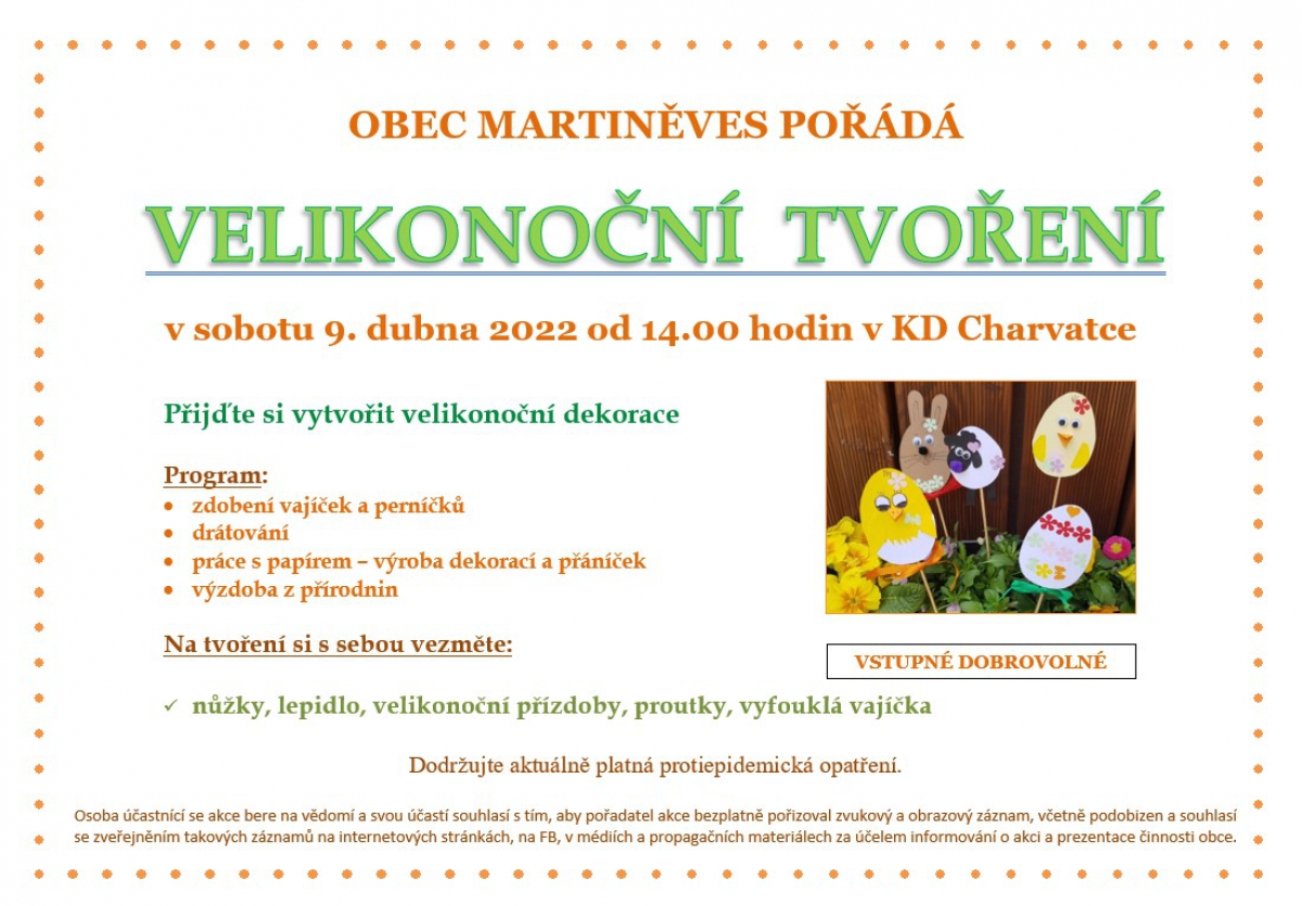 V sobotu 2.4. se uskuteční akce Ukliďme Česko. Pokud máte zájem se zúčastnit, sraz je v 9 hodin na autobusových zastávkách v Radešíně, Charvatcích a Martiněvsi. Vezměte si s sebou pracovní rukavice. Po úklidu bude připraveno společné opékání buřtů před KD v Charvatcích. Akce je pro každého.