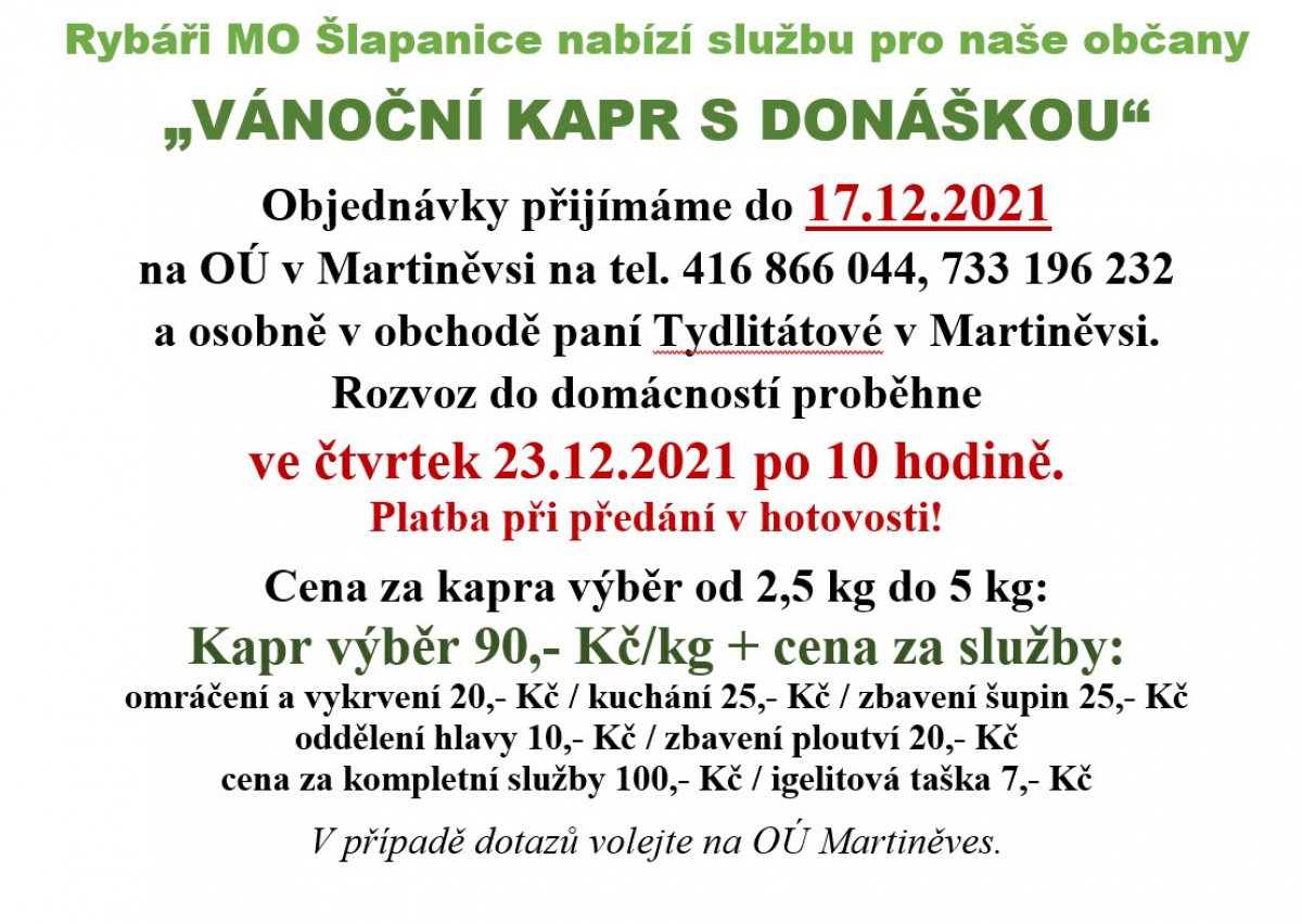 Rybáři MO Šlapanice nabízí službu pro naše občany "Vánoční kapr s donáškou".