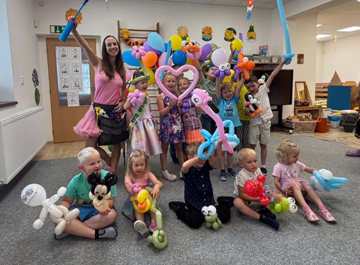 Následovalo vystoupení "Balónkové Evičky" , která během vyprávění vyráběla z balónků různá zvířátka a figurky. Děti si odnášely domů spoustu dárečků od Evičky. Pasování dětí proběhlo - šerpování, obdarování a předškoláky jsme poslaly obloukem do života.