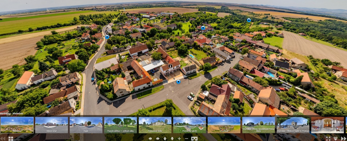 Obec Martiněves si pro Vás připravila virtuální prohlídku. Můžete se podívat na jednotlivé části obce z výšky a na některá zajímavá místa v obci zblízka.