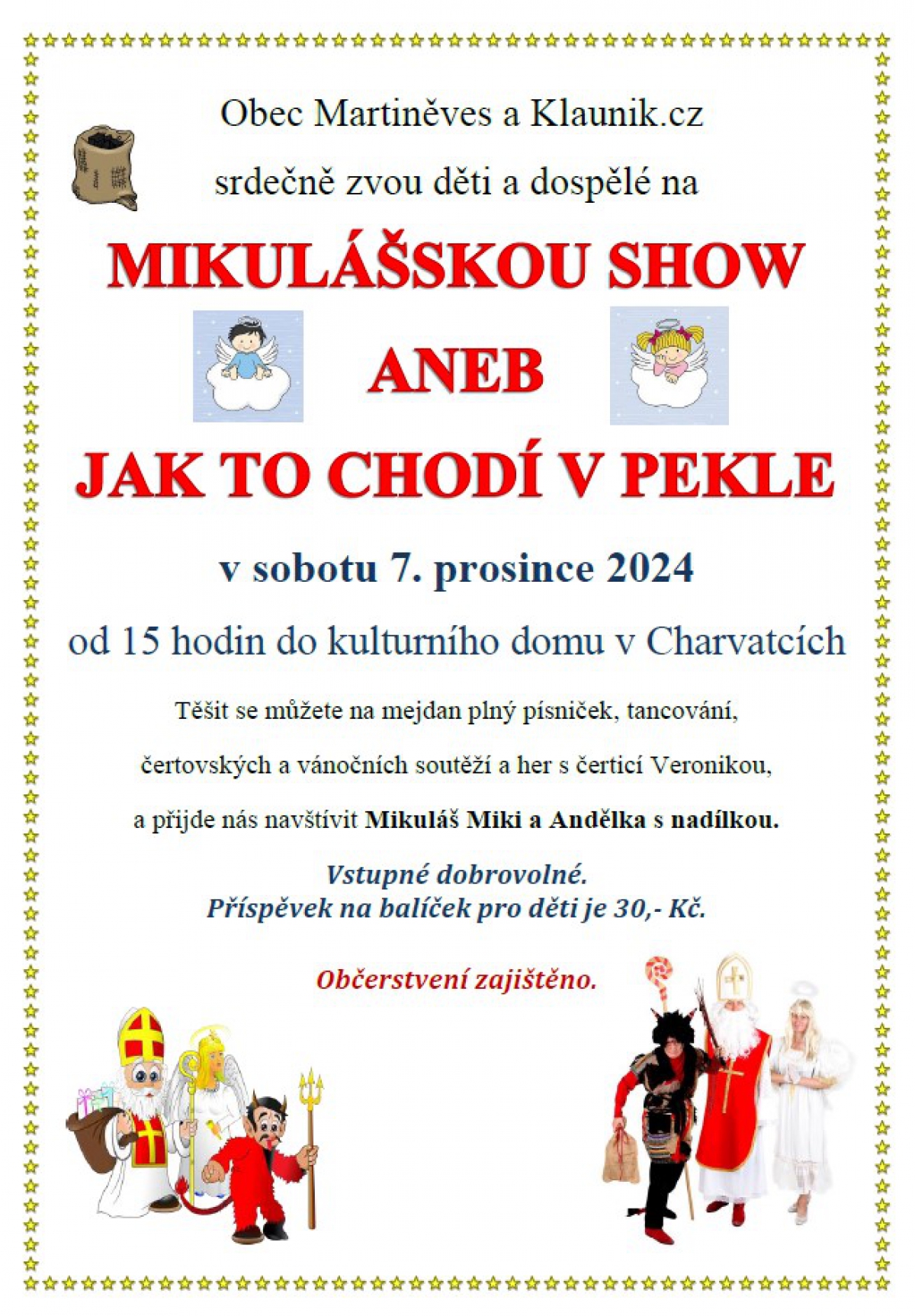 Obec Martiněves pořádá zájezd do divadla Radka Brzobohatého v Praze v neděli 20.10.2024 od 15 hodin. Vstupné je 540,- Kč a odjezd autobusu ve 13 hodin z Radešína a poté přes Charvatce a Martiněves.