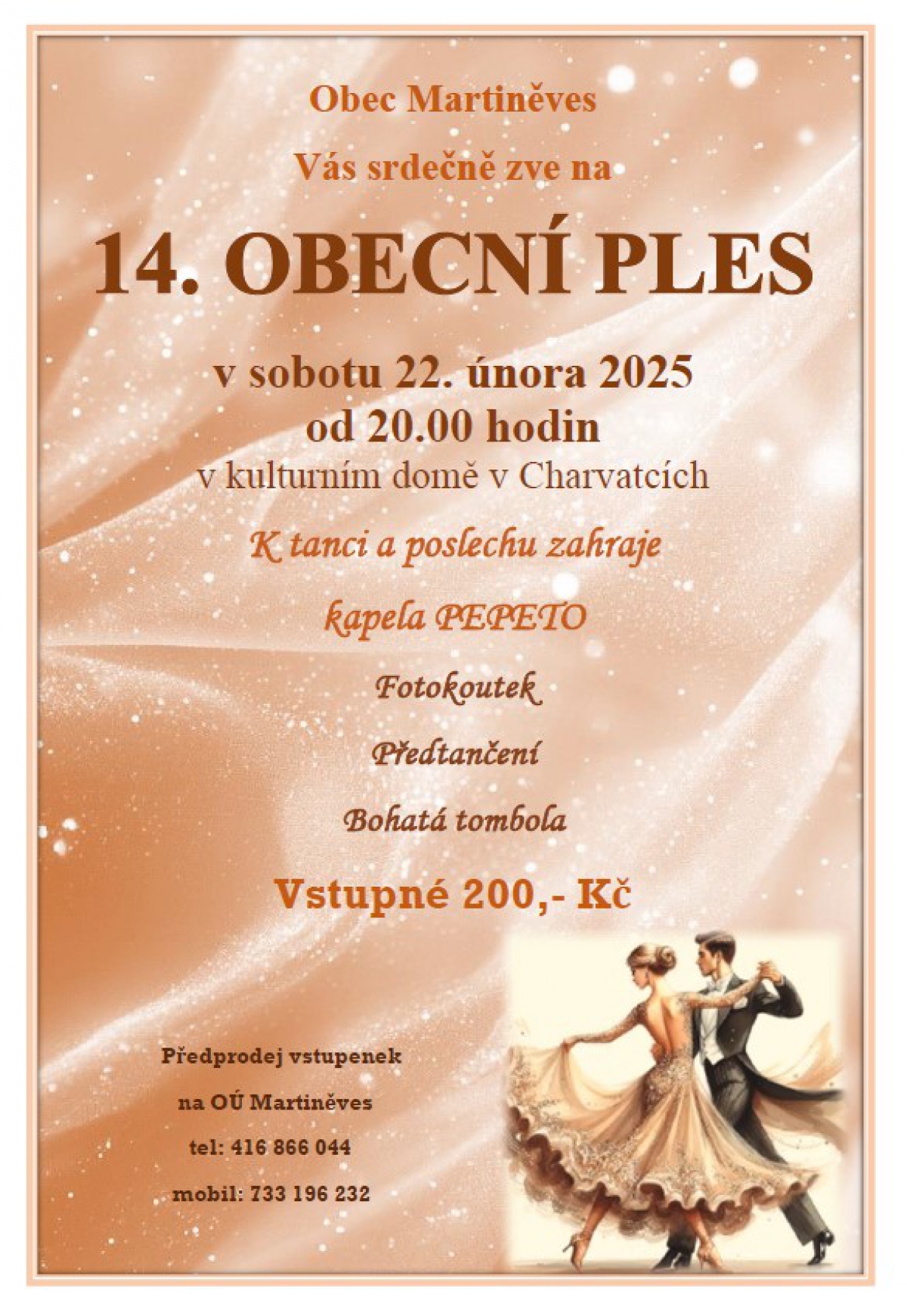 Obec Martiněves Vás srdečně zve na obecní ples, který se uskuteční v sobotu 22.2.2025 od 20 hodin v KD Charvatce. Vstupné je 200,- Kč. Předprodej vstupenek je na OÚ Martiněves, tel. 416 866 044 nebo mobil. 733 196 232.