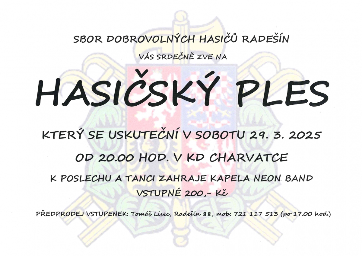 SDH Radešín Vás srdečně zve na hasičský ples, který se bude konat v sobotu 29.3.2025 od 20hodin v KD Charvatce. Vstupné je 200,- Kč a předprodej vstupenek je u pana Tomáše Lisce, Radešín 88, tel. 721 117 513 po 17 hodině.
