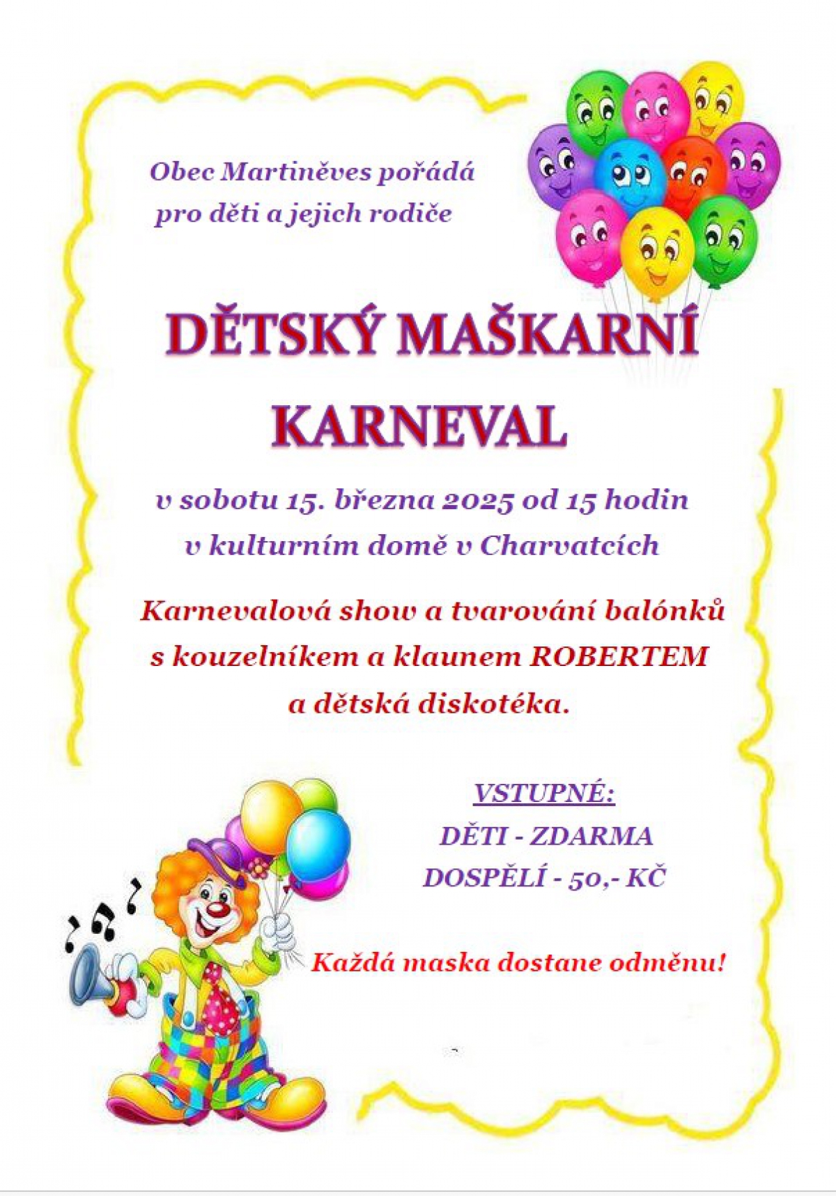 Obec Martiněves pořádá v sobotu 15. března 2025 od 15 hodin v KD Charvatce Maškarní karneval pro děti. Vystoupí kouzelník a klaun Roberto. Vstupné pro děti zdarma, dospělí 50,- Kč, občerstvení je zajištěno.