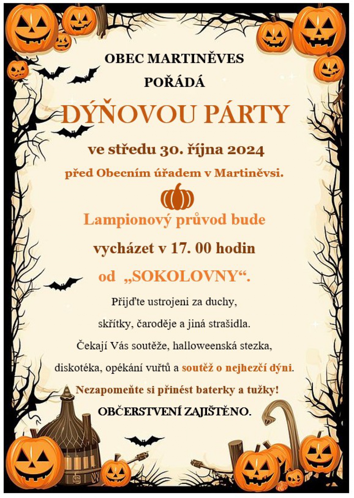 Ve středu 30.10. pořádáme Dýňovou party před OÚ v Martiněvsi. Lampionový průvod bude vycházet v 17 hodin od sokolovny. Přijďte přestrojeni za duchy, skřítky a jiná strašidla, budou připraveny soutěže, halloweenská stezka, diskotéka a opékání vuřtů. A také soutěž o nejhezčí dýni. Přijeďte si na OÚ do pátku 25.10. pro dýni, doma ji s dětmi vydlabejte a ve středu doneste na party před OÚ. Každé dítě, které se zapojí dostane sladkou odměnu.