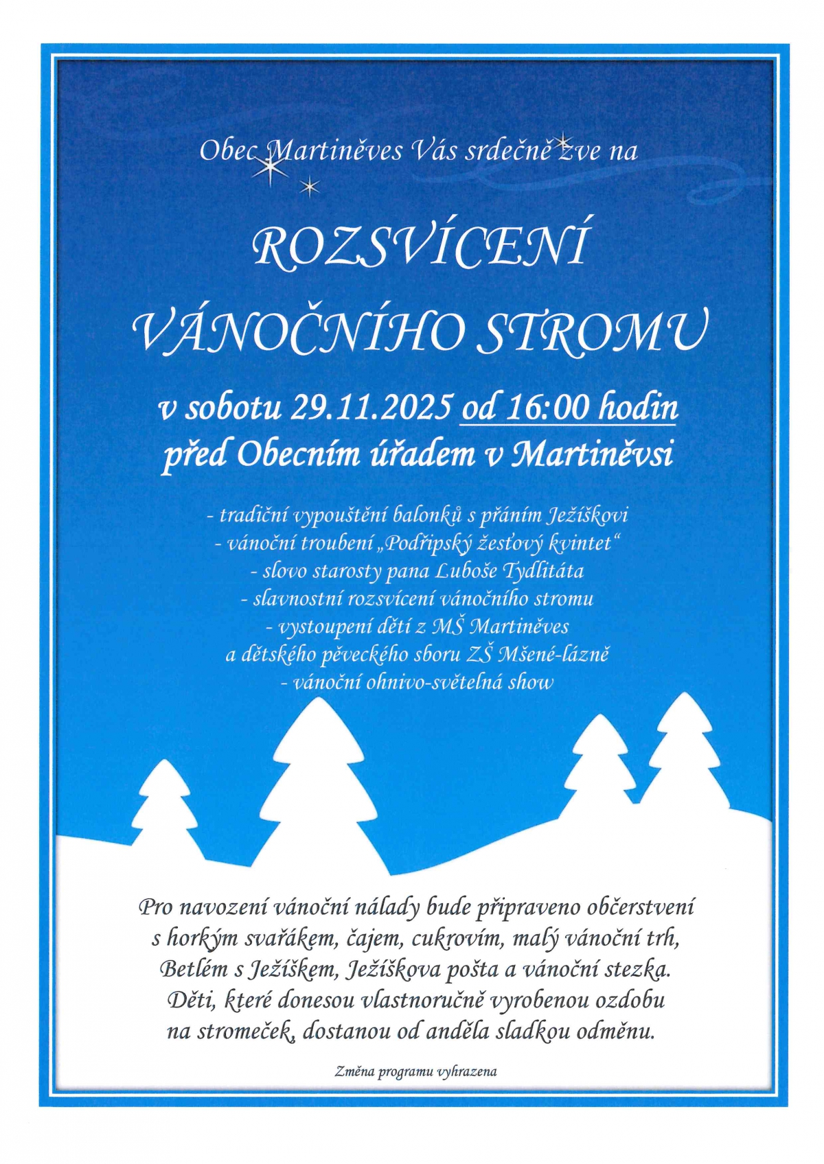 Obec Martiněves Vás srdečně zve na Rozsvícení vánočního stromu v sobotu 29.11.2025 od 16 hodin do Martiněvsi.
