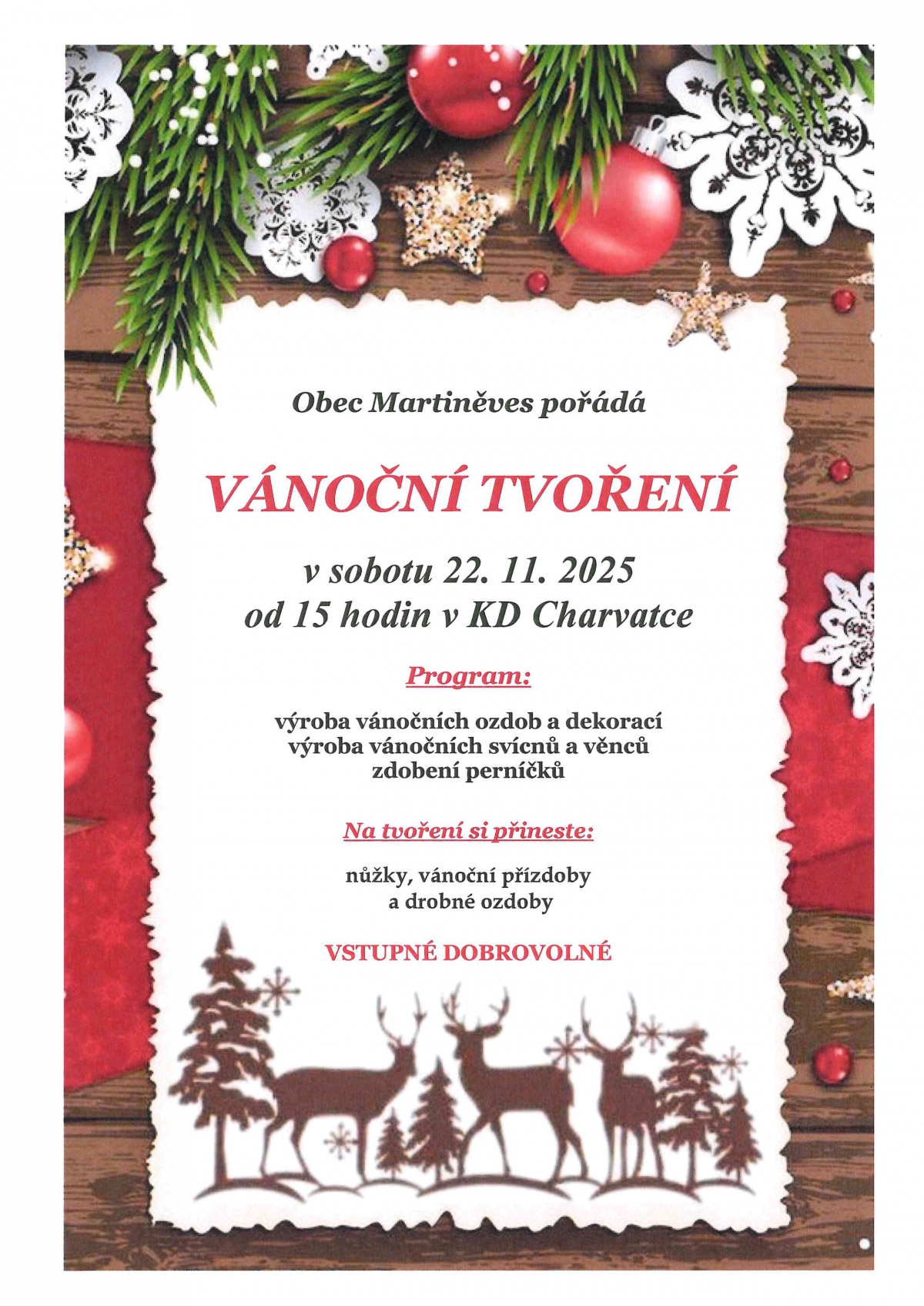 Oběc Martiněves pořádá Vánoční tvoření v sobotu 22. listopadu od 15 hodin v kulturním domě v Charvatcích.