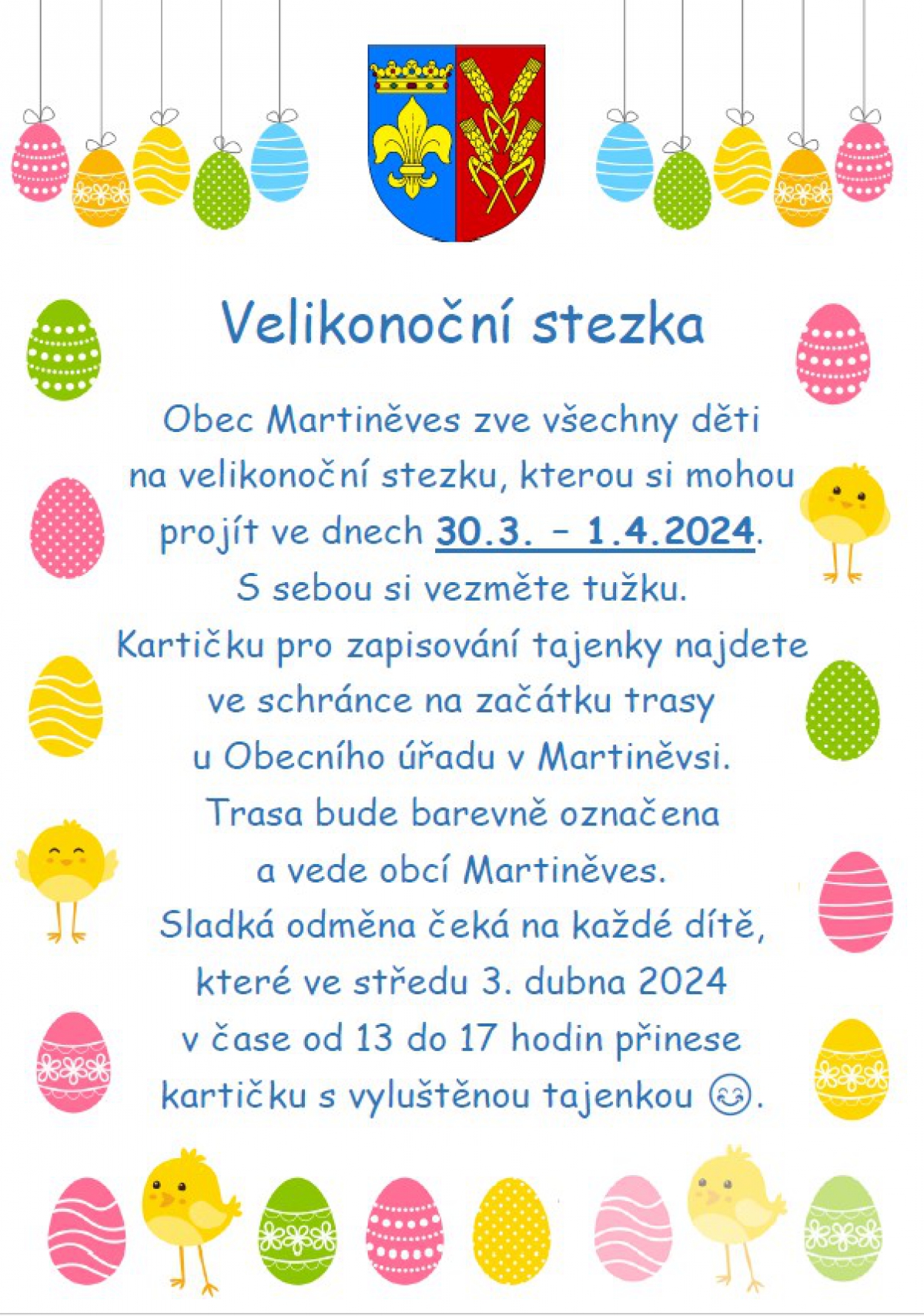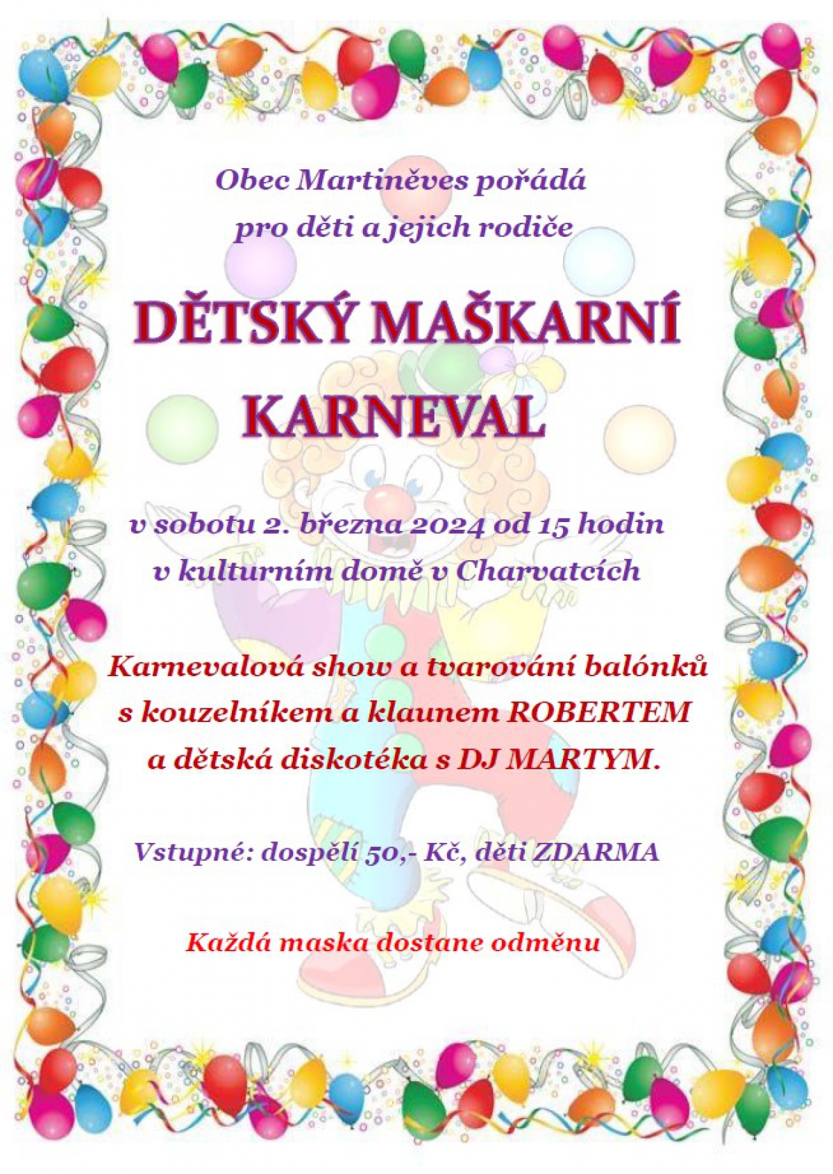 Obec Martiněves zve všechny děti MAŠKARNÍ KARNEVAL v sobotu 2. března 2024 od 15 hodin do KD Charvatce. Těščit se můžete na soutěže, kouzlení, a tancování s kouzelníkem a klaunem Robertem a na dětskou diskotéku. Vstupné: dospělí 50,- Kč, děti zdarma. každá maska dostane odměnu.