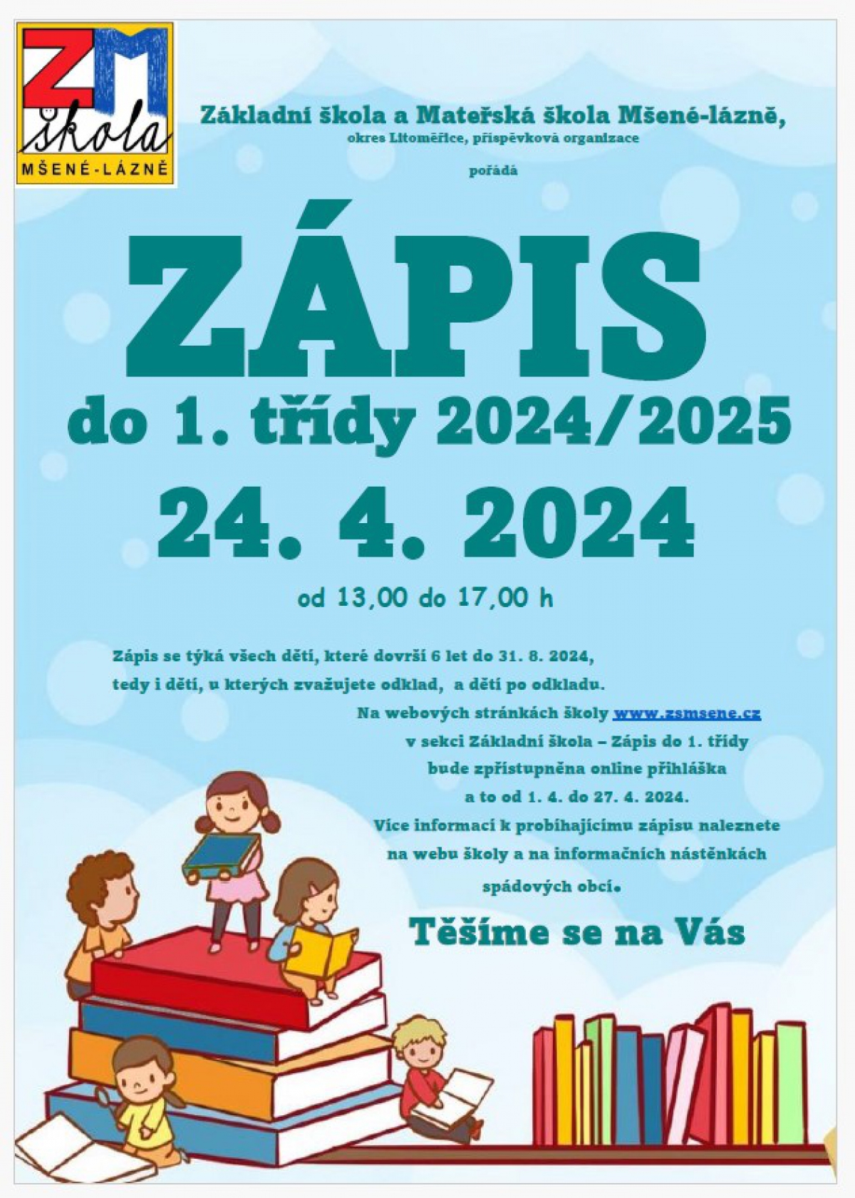 ZŠ a MŠ Mšené-lázně pořádá zápis do 1. třídy 2024/2025 dne 24.4.2024 od 13 do 17 hodin. Přihlášku a více informací naleznete od 1.4.2024 na webových stránkách školy www.zsmsene.cz.