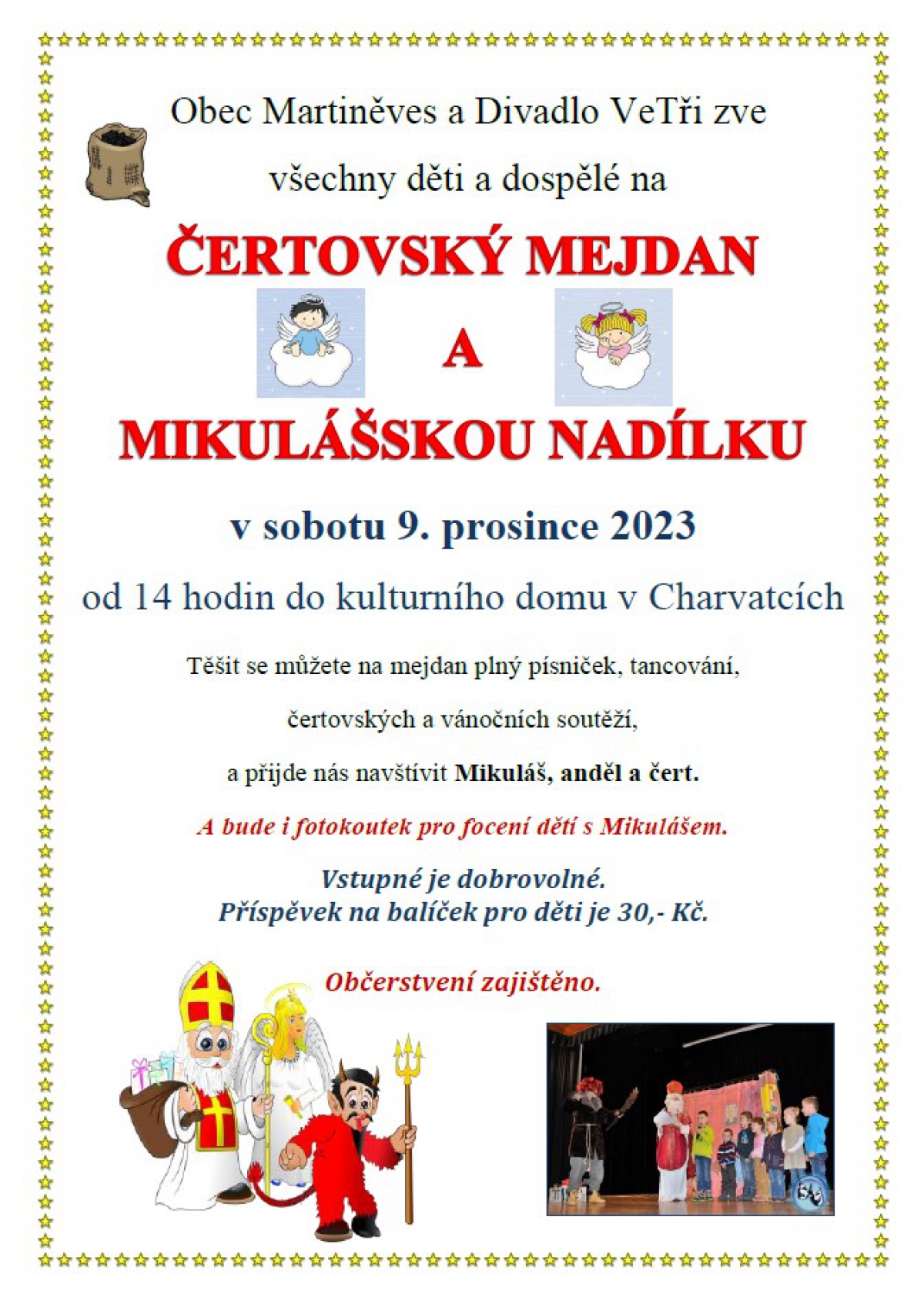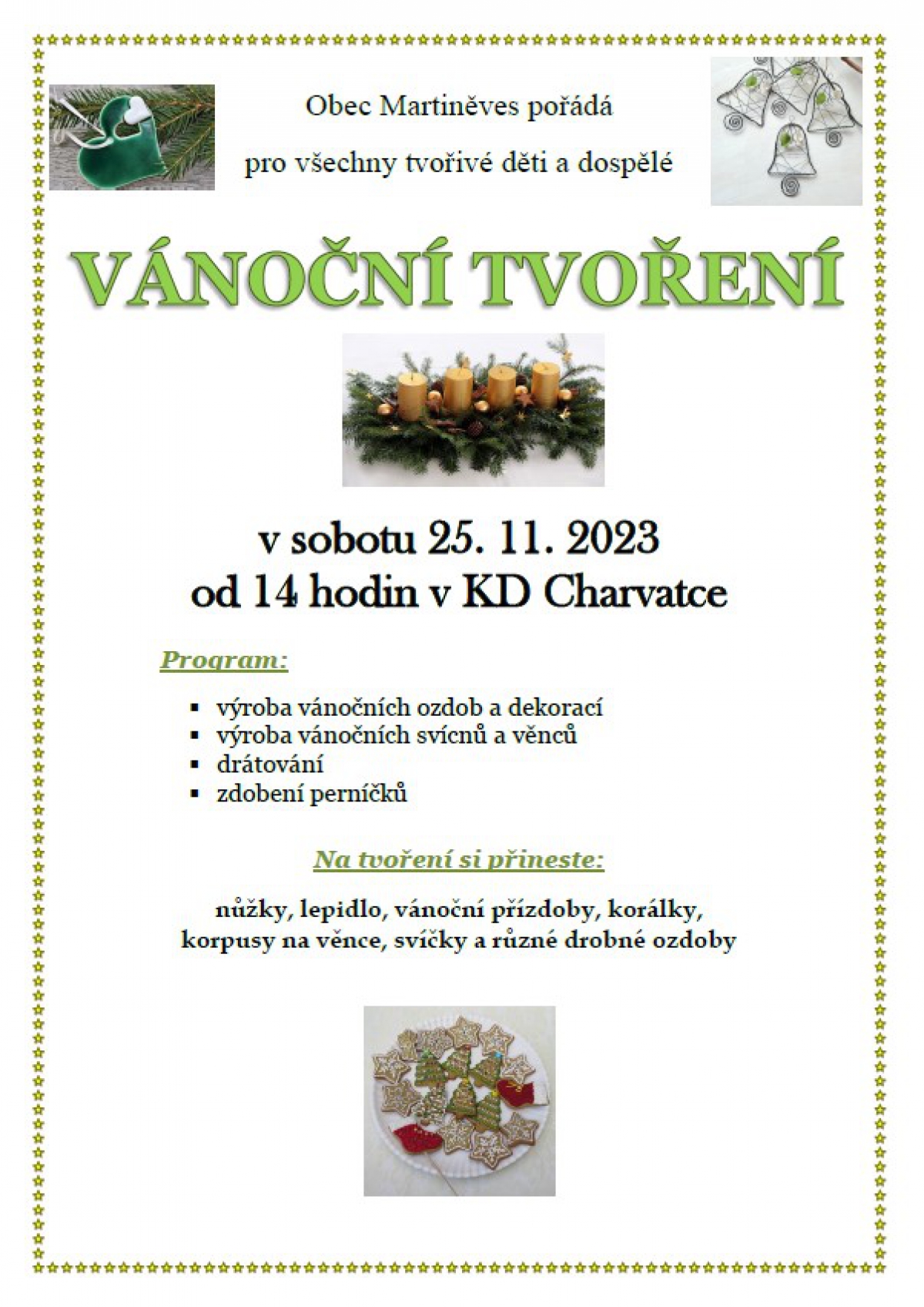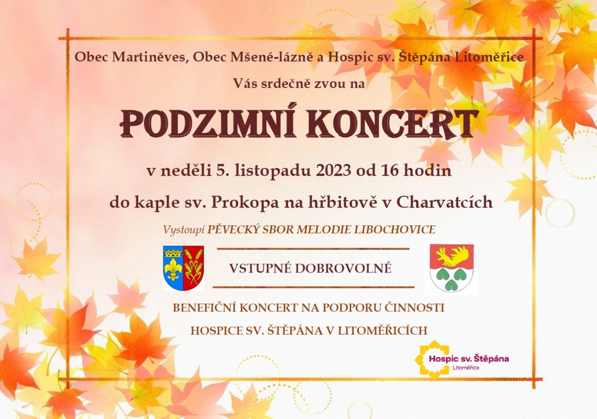 Obec Martiněves, Obec Mšené-lázně a Hospic sv. Štěpána v Litoměřicích vás srdečně zve na Benefiční podzimní koncert v neděli 5.11.2023 od 16 hodin do kaple sv. Prokopa na hřbitově v Charvatcích. Vystoupí Pěvecký sbor Melodie Libochovice a vstupné je dobrovolné. Celý výtěžek akce půjde na podporu činnosti Hospice sv. Štěpána v Litoměřicích. Občerstvení je zajištěno.