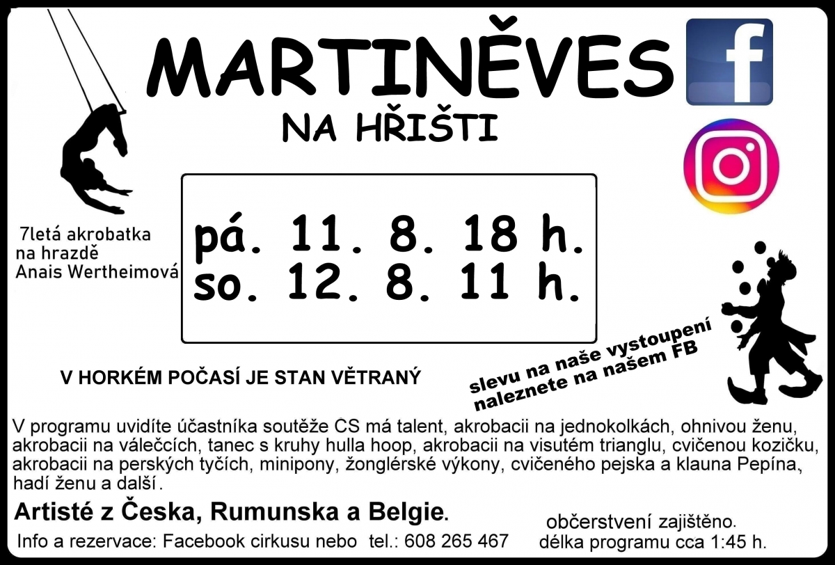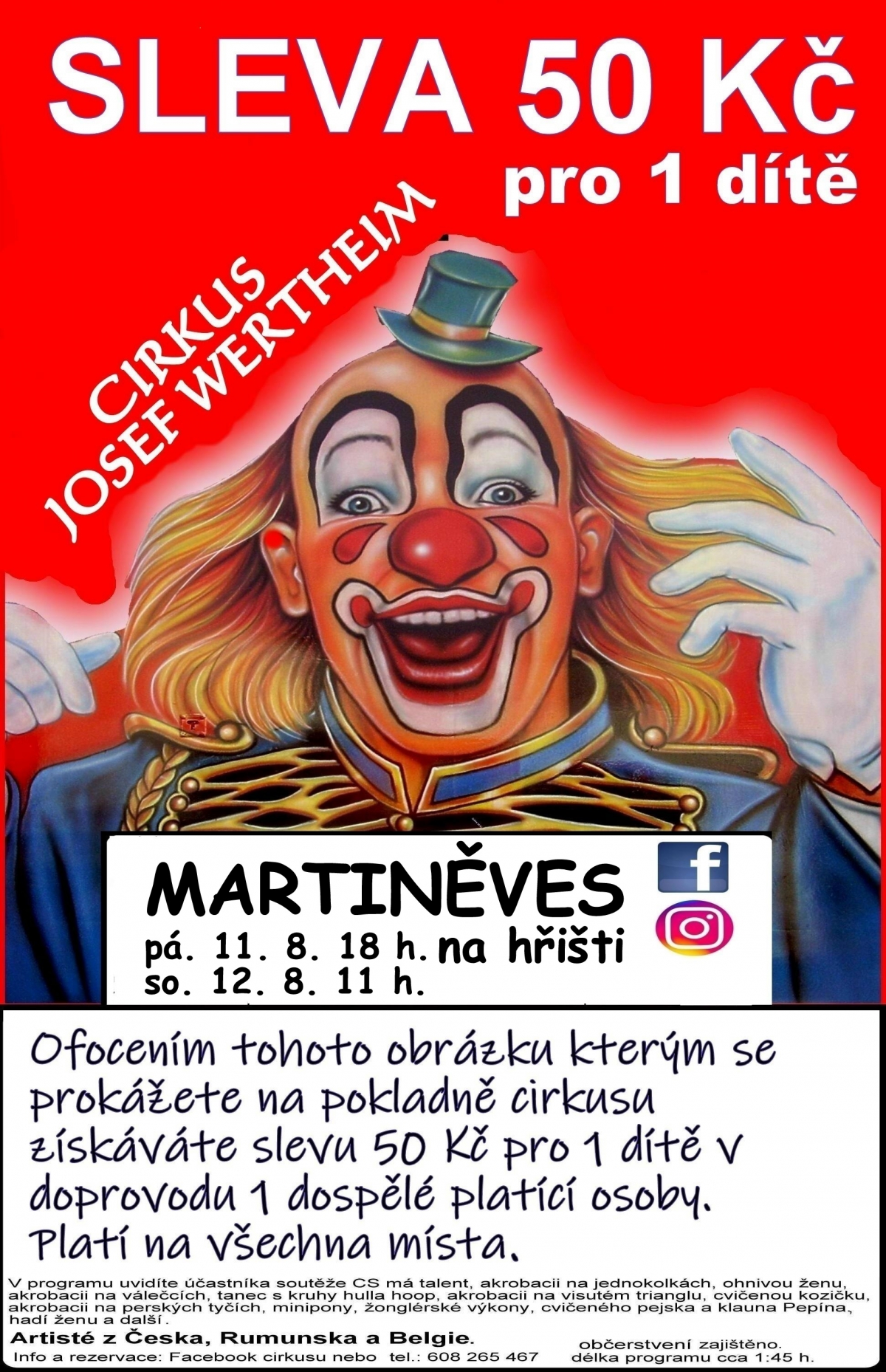 Cirkus Josef Wertheim Vás srdečně zve v pátek 11.8. a v sobotu 12.8. na cirkusové představení, které se uskuteční na hřišti v Martiněvsi. Rezervace vstupenek na tel. č. 608 265 467, sleva pro dítě 50,- Kč po předložení ofoceného obrázku klauna se slevou na pokladně cirkusu.