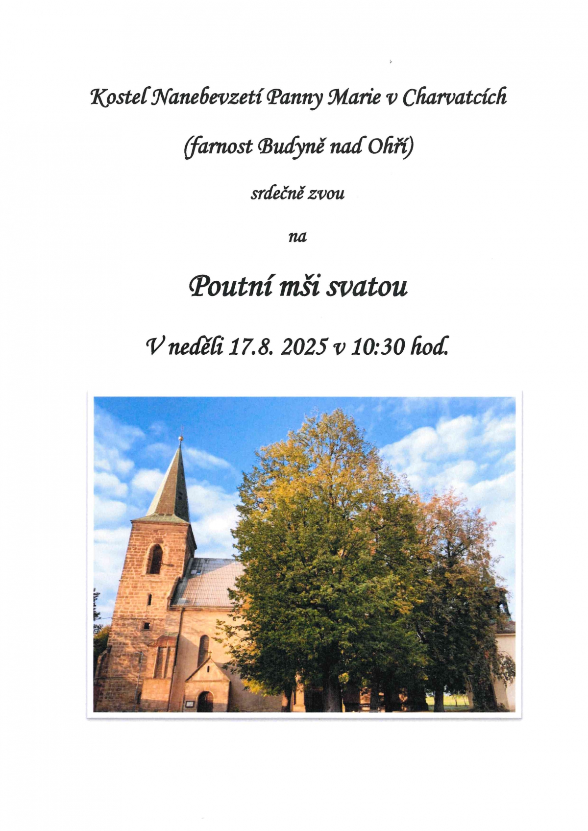 Římskokatolická farnost Budyně nad Ohří Vás srdečně zve do kostela Nanebevzetí Panny Marie v Charvatcích. V neděli 17. srpna 2025 se zde bude od 10:30 hod. sloužit poutní mše svatá za doprovodu živé hudby.