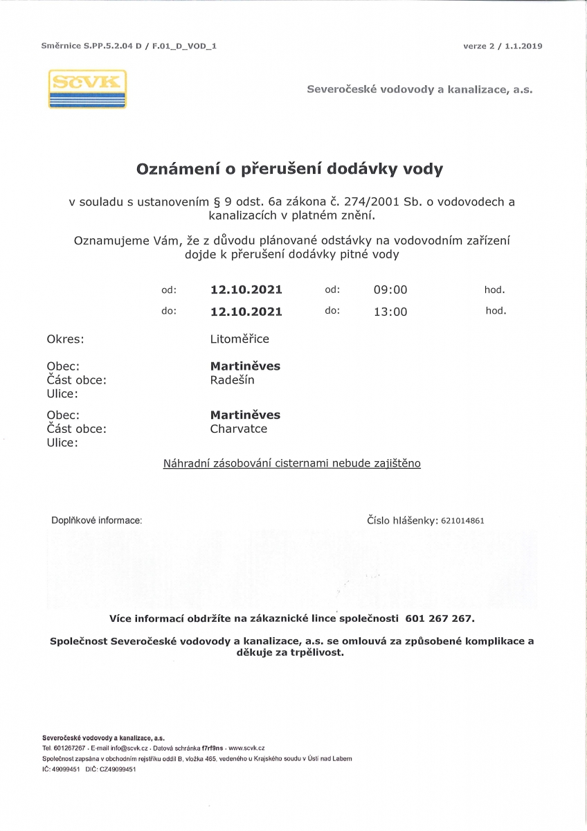 12.10.2021 od 9:00 hod. do 13:00 hod. Náhradní zásobování cisternami nebude zajištěno.