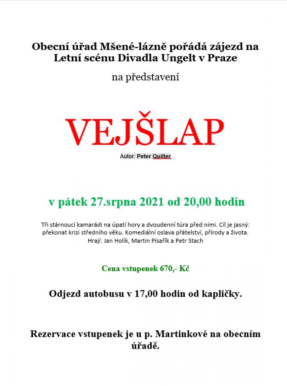 Obec Mšené-lázně pořádá zájezd na Letní scénu Divadla Ungelt v Praze na představení VEJŠLAP