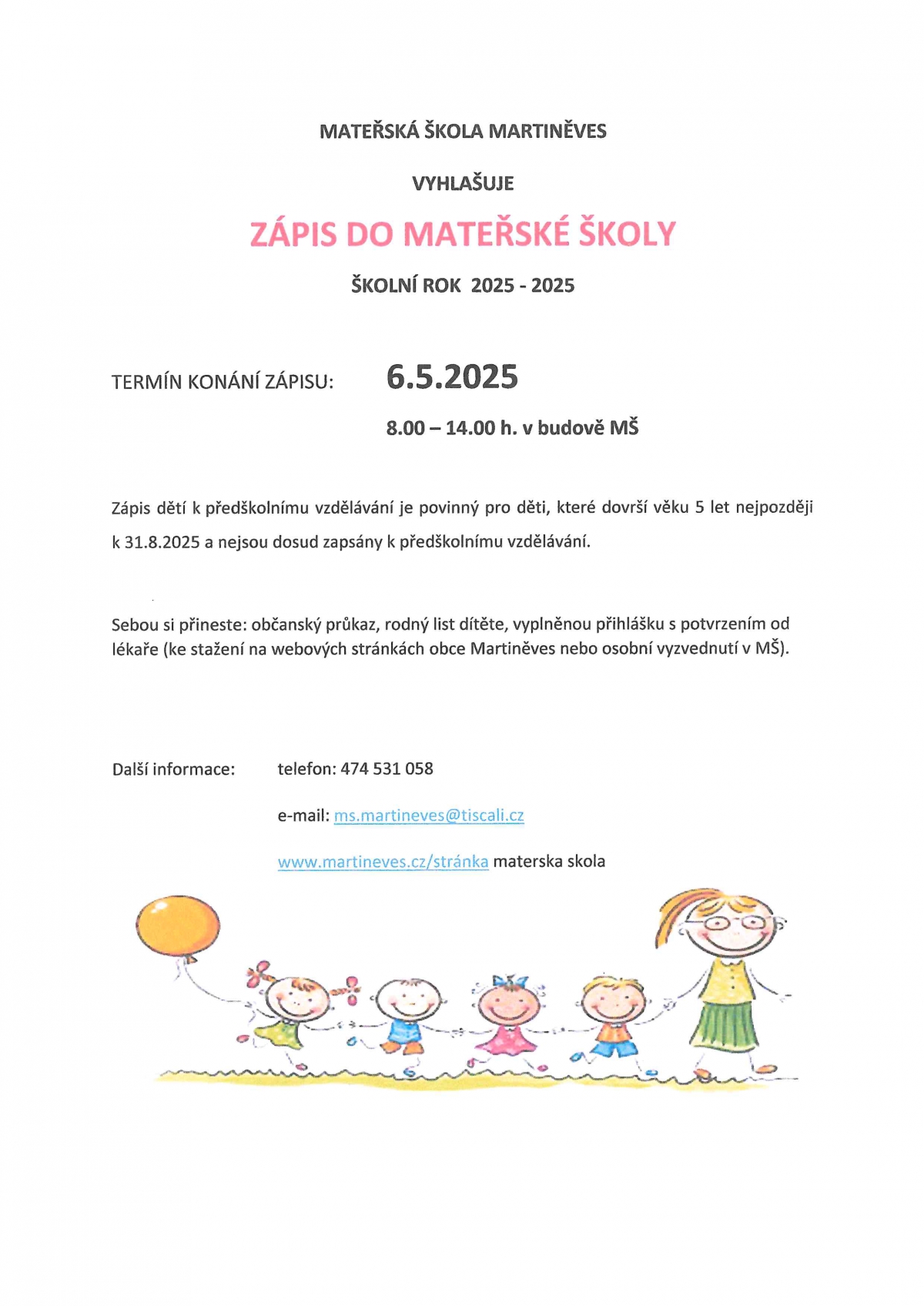 MŠ Martiněves vyhlašuje zápis do mateřské školy na školní rok 2025-2026. Termín zápisu je 6.5.2025 od 8 do 14 hodin v budově MŠ.
